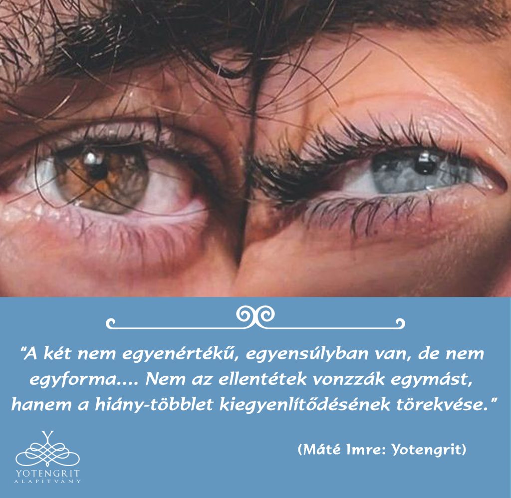 “A két nem egyenértékű, egyensúlyban van, de nem egyforma…. Nem az ellentétek vonzzák egymást, hanem a hiány-többlet kiegyenlítodésének törekvése.” (Máté Imre: Yotengrit)