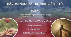 - Három Nádszál Klubbeszélgetés: 2025.10.03. 18:00-20:30HálaHála-minőségek és azok ereje A háláról sok mindent nem tudunk. Többnyire csak egy minőségében éljük meg, bár sajnos sokaknak még ez sem sikerül… A hála… További információ: Három Nádszál Klubbeszélgetés: 2025.10.03. 18:00-20:30